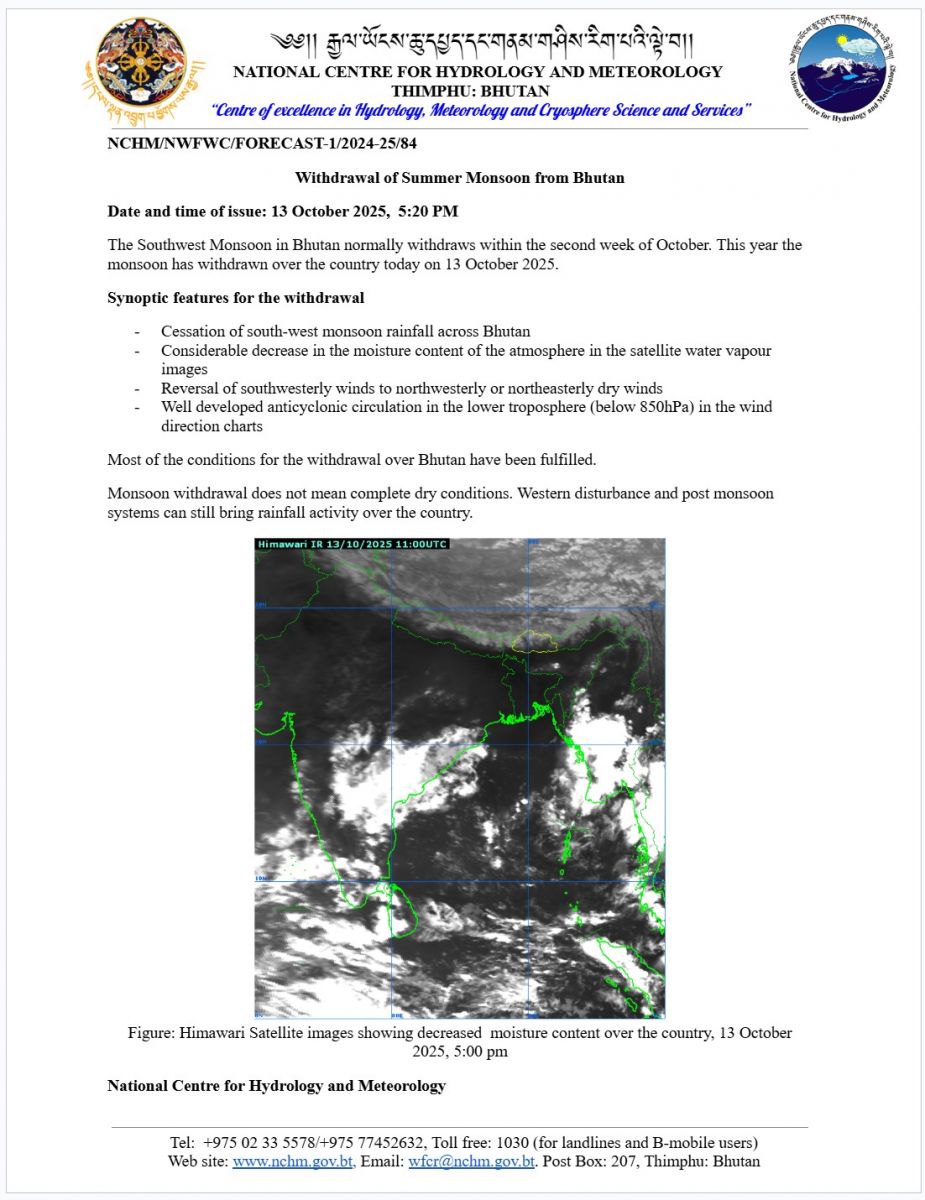 Under the influence of the system, moderate to heavy rainfall is very likely in southern and isolated places of eastern Bhutan during the next 72 hours (10th-12th October). While isolated places of central and western parts of the country is likely to receive light rainfall.