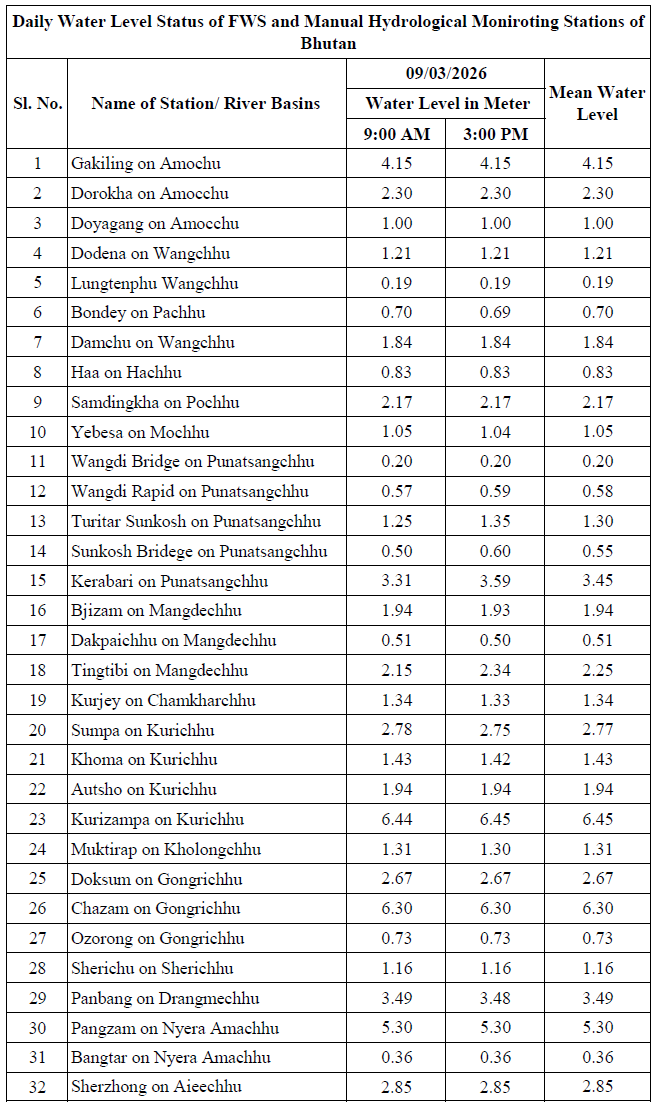 Daily Water Level Status of Manual Hydrological Monitoring Stations of Bhutan Updated on 09/03/2026
