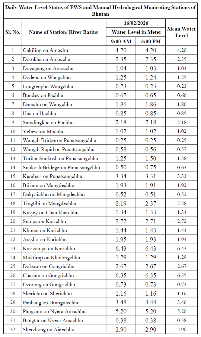 Daily Water Level Status of Manual Hydrological Monitoring Stations of Bhutan Updated on 16/02/2026