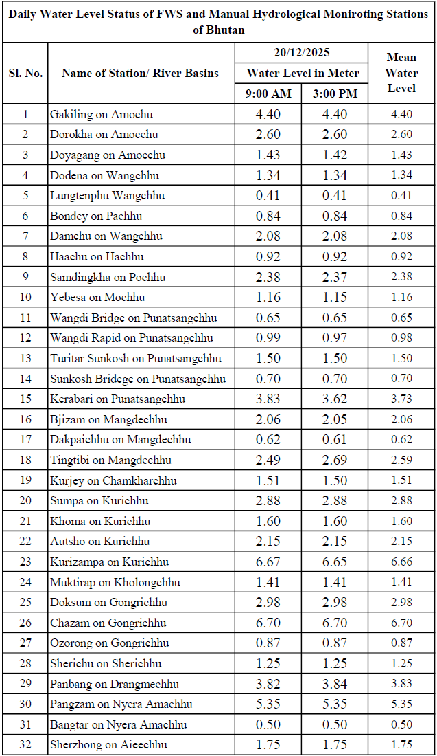 Daily Water Level Status of Manual Hydrological Monitoring Stations of Bhutan Updated on 20/12/2025
